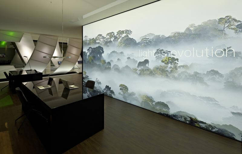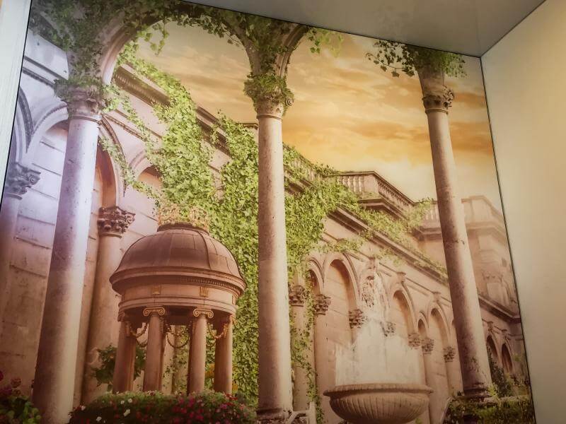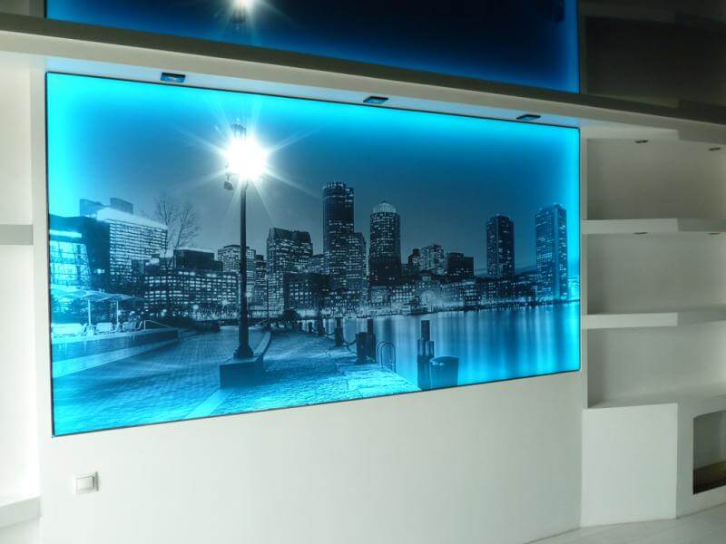 Nuotraukos ant sienu tai yra įspūdingas nestandartinis erdvės dizaino sprendimas. Šio interjero ypatumas yra vertikalus įtempiamu lubų montavimas. Tokios sienos ne tik pabrėžia turto ar įmonės savininko stilių ir statusą, bet or padeda efektyviau pristatyti savo prekės ženkla.
